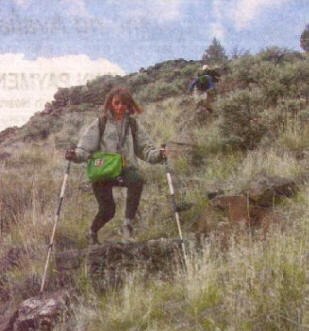 The challenge begins at the beginning - finding a break in the rimrock cliff where you can make it down to the steep (but navigable) hillside below. We found our break- a place the geopundits have labeled Smokey's Gate because of a bear shaped rock formation there - and got about the business at hand. Which was to scramble down the hill while making sure that we didn't go out of control, stumble and do a high-velocity face plant.